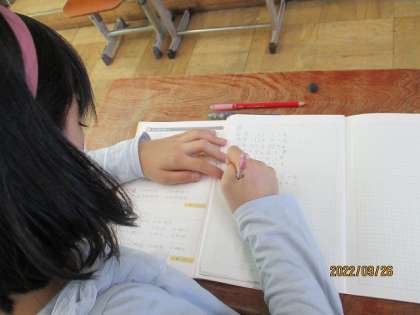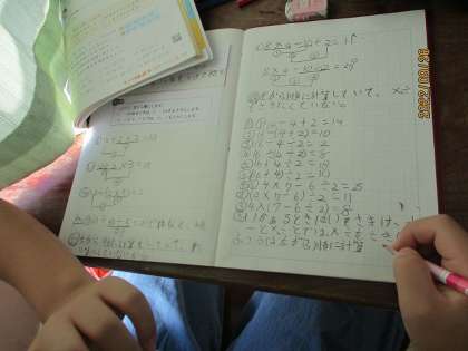 ( )や ×、÷などがある式で、計算の順序に気をつけて計算をする練習をしています。すらすらとできた人は、教科書のもっと練習の問題にも取り組んでいました。