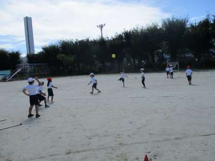 パスゲームに慣れてきたので、ゲームが白熱してきました。パスを受けやすいところに移動できる子も増えてきました。