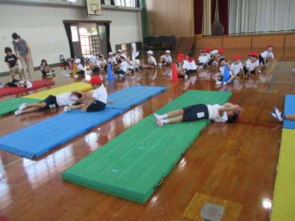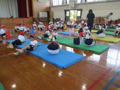 お楽しみ走は、マットで前回りでスタートします。マットからはみ出ないように練習です。
