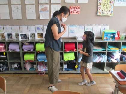 外国語活動の始まりです。初回は、挨拶や気持ちを表す表現を中心に学習しました。覚えたてのフレーズを使って、友だちや先生とたくさん会話を楽しみました。