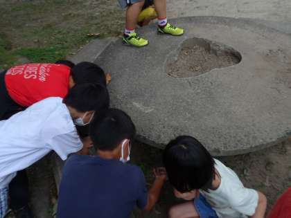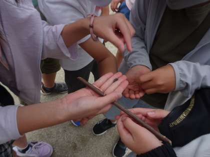 生き物探しをしに校庭へ出ました。「こんなところにダンゴムシが!」「バッタ捕まえた!」など、みんなであちこち探して楽しい授業でした。