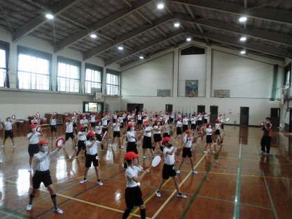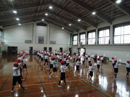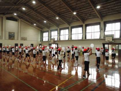 学年合同で練習をしました。向きを変えたり,しゃがんだり,みんなで動きを合わせました。