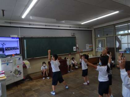 あいにくの雨で、今日は教室で全校ダンス練習でした。動画を見ながら動きの確認をしました。