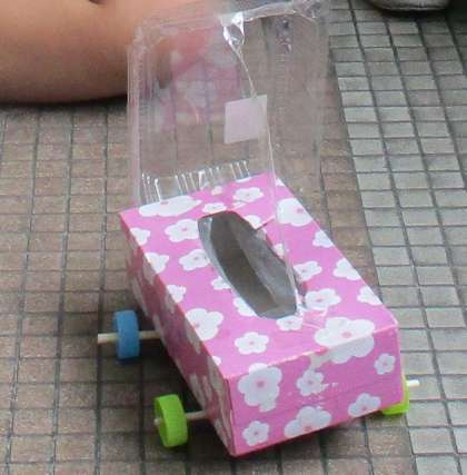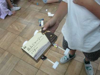 生活科で「あそんでためしてくふうして」の学習をしています。動くおもちゃを作ってみようということになりました。車を作ることになり、班で相談して作ることができました。風の力で進む車を考えた班は、さっそく箱に羽を取り付ける工夫をしていました。これからも、どんどん工夫して、おもちゃ作りをしていきたいと思います。
