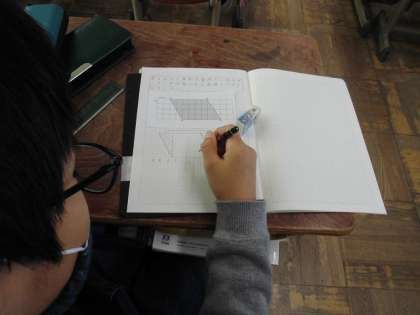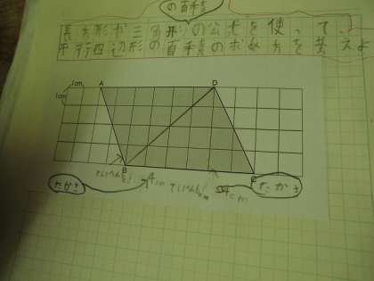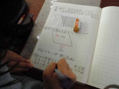 長方形や三角形の面積の公式を使って、平行四辺形の面積を求めました。色々な角度から図形を見ている児童が多く、たくさんの考えが出ていました。