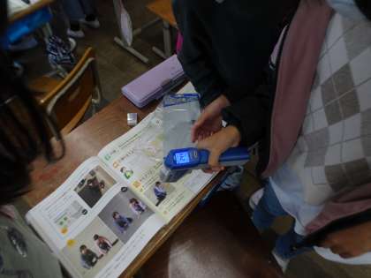 放射温度計を使って、明日は地面の温度を測ります。晴れて観察ができるといいです。今日は温度計の使い方や観察計画、予想をたてました。
