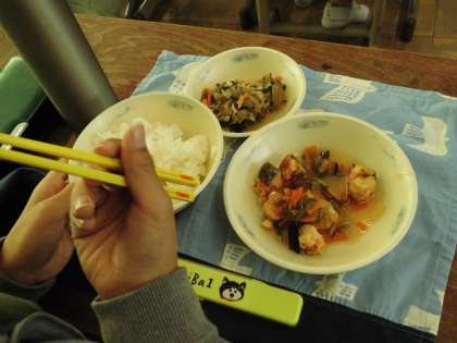 今日は「鮭の野菜あんかけ」でした。秋や冬に旬を迎える鮭。みんなで美味しくいただきました。また、魚の中でもカロリーやエネルギーが高いため、熊は冬眠前に捕食することを知りました。(冬を越すためにたくさん栄養が必要なのです。)