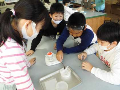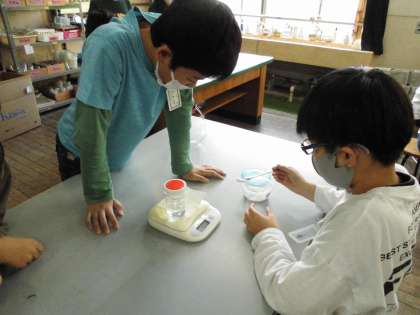 「もののとけかた」の学習です。水に溶かした食塩がどうなるのか重さをはかる実験をしました。重くなるのではないかという予想もありましたが,結果は・・・お家で聞いてみてくださいね。