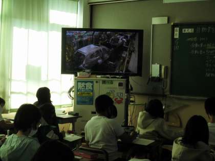 自動車の組み立て工場の様子を映像で見ました。組み立てラインの様子にみんな驚いていました。