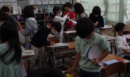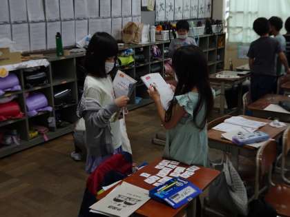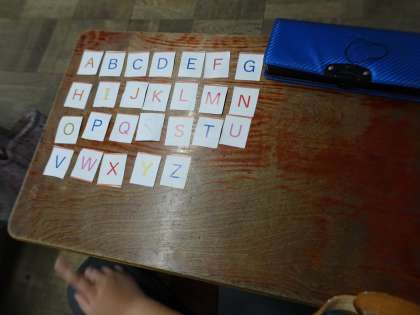 アルファベットの歌を何度も繰り返し練習しています。友達の名前の頭文字カードを受け渡したりして、アルファベットに慣れ親しんでいます。