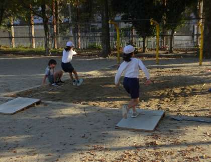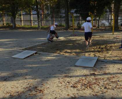 どうしたら遠くまでとぶことができるかを考えながら、何度もとんで試しています。最高記録が出て、喜びの声が聞こえました。