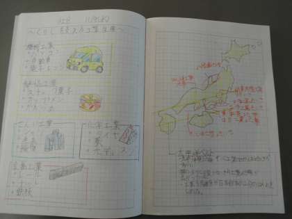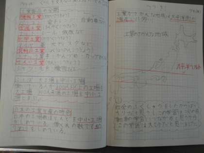 社会科の自主勉ノートです。図に書いたり,四角で囲ったり,工夫してまとめています。素敵です。