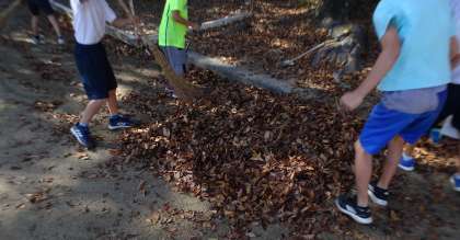 体育ではばとびをした後、落ち葉がたくさん落ちていることに気付きました。なんとなく落ち葉を集めてみた子どもたち。「ふかふか!」「いっぱい!」身近な秋を感じる瞬間でした。