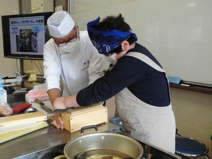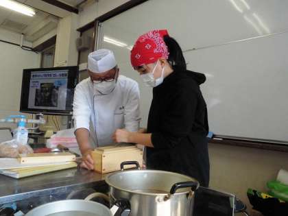 京料理「松廣」から特別に先生をお招きし、授業をしていただきました。今回は和食の柱、「だし」です。子どもたちもとても楽しみにしていた時間です。これは、鰹節の作り方を知り、実際に鉋で削っています。いい経験をしました。