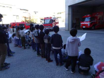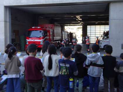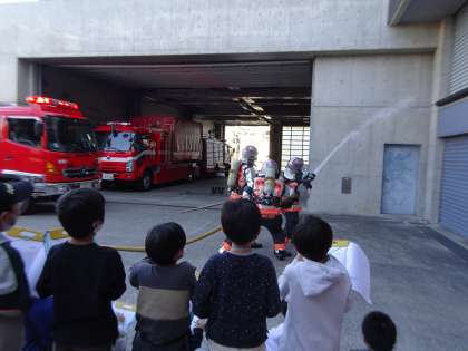 午後からは消防署へ行きました。消防隊員の方が実際に出動するときの様子を見せてくださいました。20kgほどの装備を身に付け、出動される姿にみんな驚きと感心の表情でした。