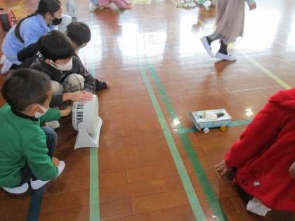 風で動く車。送風機で風を送ると、ビューンと前進しました。