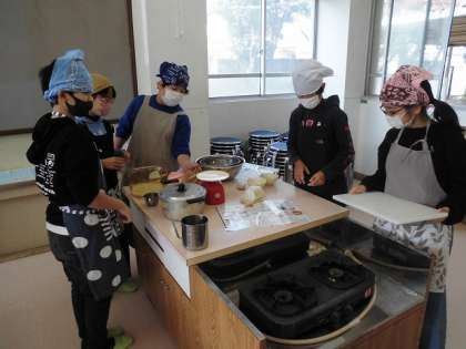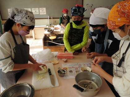 食材を切ったり、分量を調節したりしています。各グループ、役割分担し、手際よく差作業を進めていました。