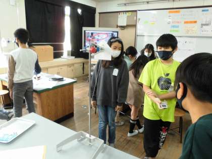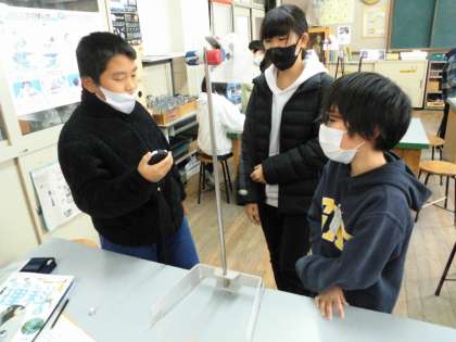「角度は20度!」「タイマーの用意はいい?」声を掛け合いながら振り子の長さを変えてどのくらいの時間がかかるのかを調べました。3回計測したら平均を出します。「あ〜,前に算数でやった!」どのグループも頑張っていました。