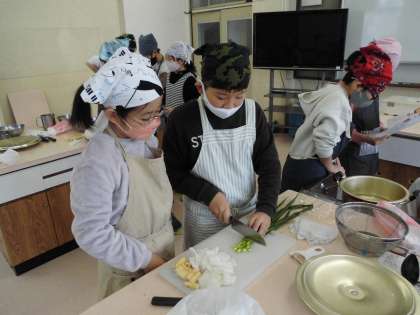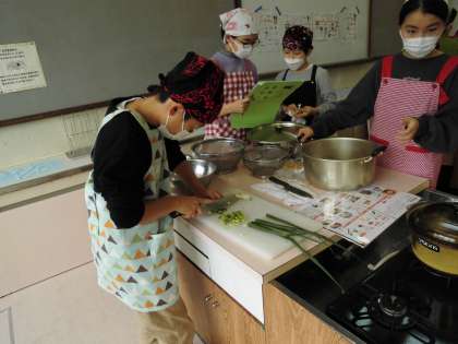 みそ汁の具材を切るのも順番に交代し,いろいろな作業をみんなができるようにしていました。役割分担もお互いに声を掛け合って上手に進めていました。