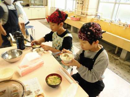 「おいしい」という声がいっぱい!自分たちで作ったごはんとみそ汁は格別のおいしさだったようです。