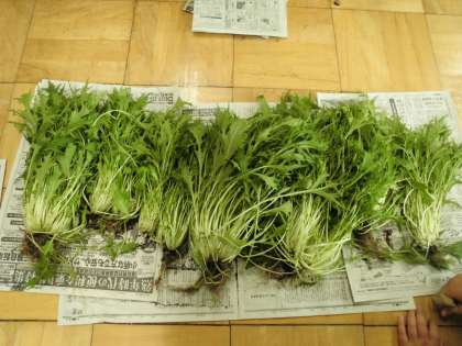 育てていたミズナが大きくなってきました。クラスのみんなで一株ずつ収穫しました。お家に持って帰り,やわらかなところはサラダに、そのほかはなべ物に入れたり煮びたしにしたりして、おいしく食べることができました。
