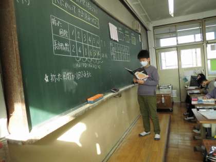 「表を使って考えよう」学習です。紙を折ってできる長方形の数について順に調べて変化のきまりを見つけました。どのように考えたのかをみんなに説明しています。