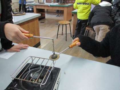 金属をあたためると、どうなるのかを実験しました。また、結果をプリントにまとめました。火を使った実験でしたが、安全に気をつけて行うことができました。