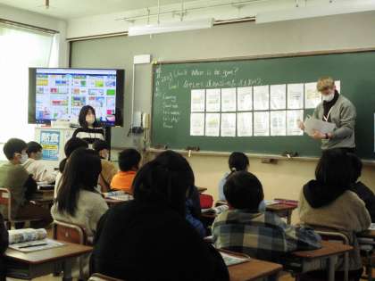 「店や施設,道案内の言い方を知ろう」の学習です。ALTのキャメロン先生と一緒に新年最初の学習です。