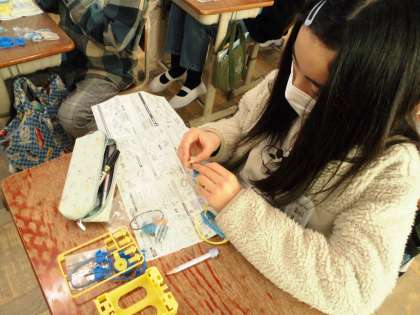 みんな集中して電磁石を作っています。自分で説明書を見ながらチャレンジしている人もいます。がんばれ〜!
