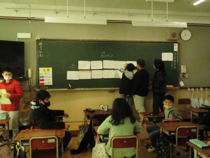 3学期最初の委員会活動です・児童会本部では12月の目標のふりかえりと「名札をつけよう」運動の成果と問題点を確かめました。