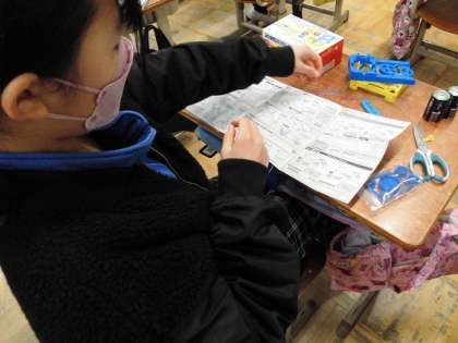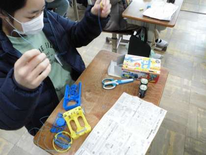 電磁石の学習で、電流装置を作製しています。自分で組み立てることで、電磁石の仕組みがしっかりと理解できるといいですね。