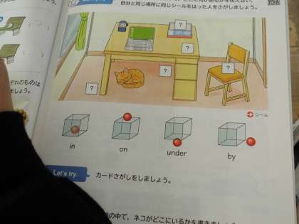 モノがどこにあるのかを伝える表現の仕方を学習しています。「on」「in」「by」「under」を使って伝えることができると知りました。