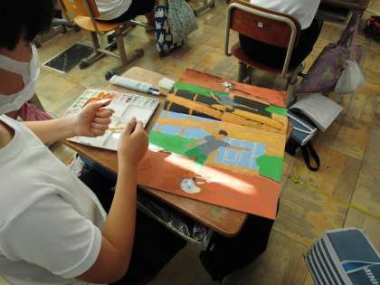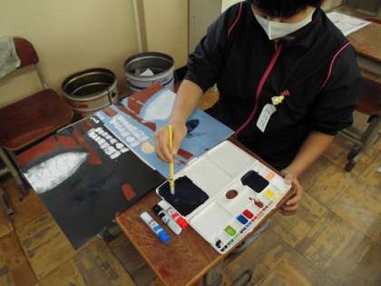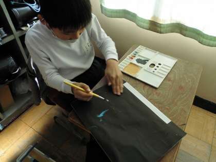 彫った作品を印刷しています。色をじっくり選び、丁寧に刷っていました。