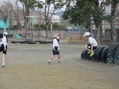 3学期の最初の体育では、なわとびとゆっくりペース走に取り組んでいます。なわとびでは、二重跳びなどの技に挑戦したり、何回も跳んだりしています。また、大繩では、8の字跳びや同時に何人かで跳ぶなど、色々な跳び方を友達と楽しんでいました。