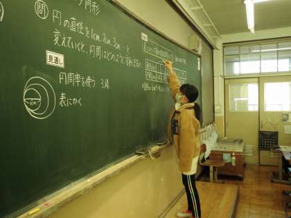 円と正多角形の学習です。円の直径と円周の関係を表に書いて調べ気が付いたことを話し合いました。,
