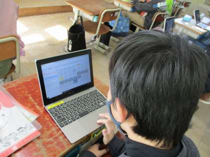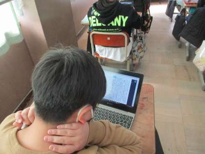 お話の要約をして、自分の感想を書きました。パソコンを使うと文章を直しやすい様子でした。書いた後は、友達と読み合いました。
