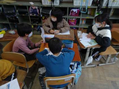 伝えたいことを言葉で表すことについて考え、冬休みの出来事とそのときの気持ちを200字で書きました。普段よく使っている「楽しかった」「よかった」「おいしかった」などの言葉を別の言葉で表すことはできないかなと国語辞典をひいたりして考えました。みんなで書いた文を交流すると、新しい言葉の発見がありました。