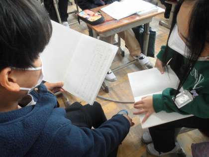 5年生同士で伝え合っている言葉は、はたして1年生も理解できるのか考えました。文末表現を工夫したり、言葉を選びなおしたりして、考え直した文章を交流しました。