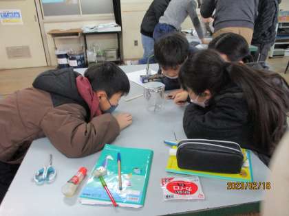「もののあたたまりかた」の学習で、今日は空気の温まり方について実験しました。ビーカーの中に線香を入れて、煙の動きを観察しました。