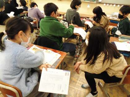 お互いに考えたことを交流しています。「自分ならどうするかな?」「これからどんなことができるかな?」