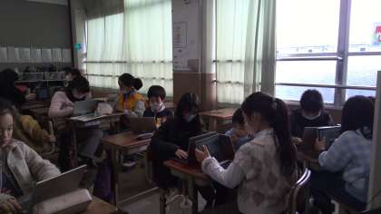 調べたい地方やものを選んで、グループに分かれて調べてまとめる学習をしています。グループで分担してタブレットを使って調べています。
