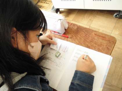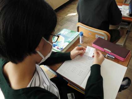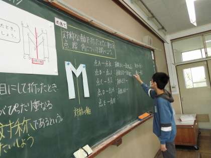 対称な図形の学習です。対象の軸で折り重ねてぴったり重なる点・線・角について調べました。