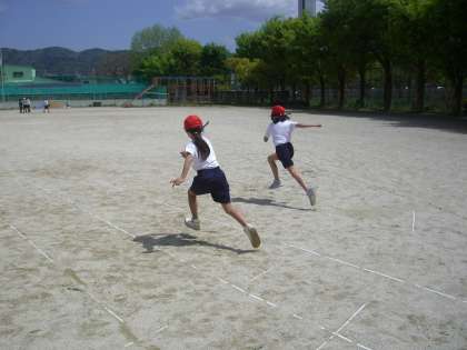 5年生の交流学習の体育の時間に50m走のタイムを測りました。ひさしぶりに走って疲れた様子でしたが,一生懸命,ゴールまで走り切りました。