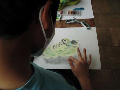 自分の運動靴をスケッチしました。汚れの表現も、コンテを削って擦るなど、工夫された取り組み方が見られました。
