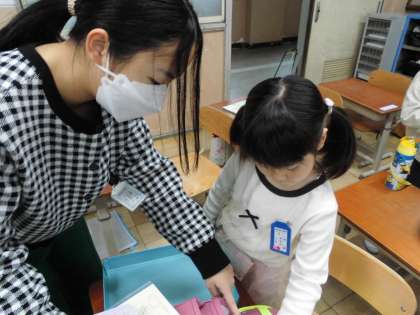 1年生の朝の支度のお手伝いをしてくれています。本当にやさしく丁寧に声を掛けながらお世話をしてくれています。とっても素敵です。いつもありがとう。