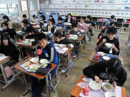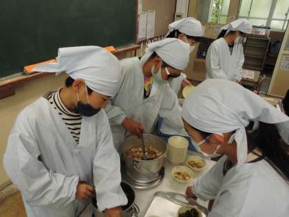 手際よくみんなで協力して準備しています。準備ができたら美味しくいただきます。いつもおいしい給食をありがとうございます。