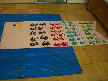 手形をいっぱいスタンプして,みんなで描きました。それぞれパートを担当しましたが,どの手がだれの手でしょうか?来週火曜日に参観がありますので,ぜひお子さんにきいてみてくださいね。