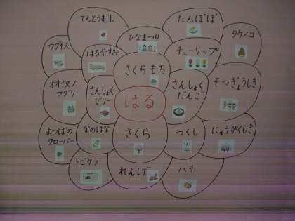 「はる」といえば…というお題で,言葉集めをしました。たくさん春らしい言葉を見つけることができました。その言葉から,カルタを作ることにしました。素敵な読み札と取り札ができました。どちらも壁に掲示しましたので,来週火曜日の参観時に読んでくださると嬉しいです。