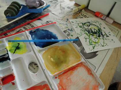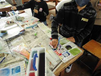 初めての図工室で、さまざまな技法を用いて、きれいな模様をつくりました。