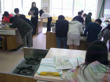 交流学習で家庭科室になにがあるか調べました。いろいろな道具があり,使ってみたい気持ちが高まっていました。